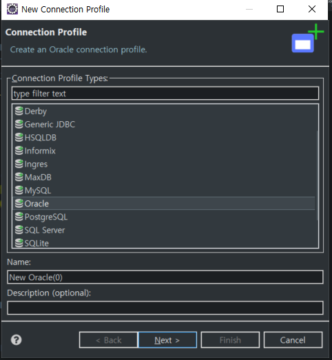 perspective -> database Connetions (우클릭 -> new) -> oracle ->