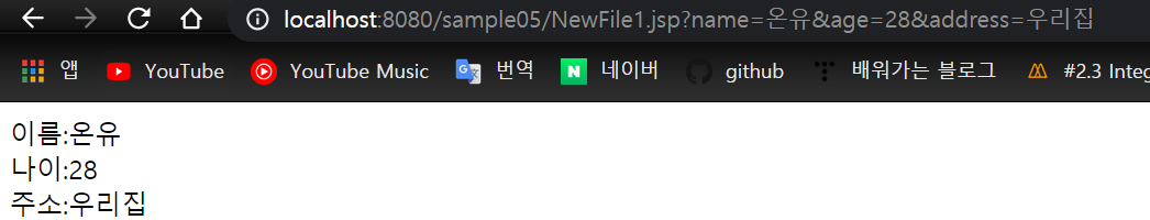 Newfile1.jsp?name=?&age=?&address=? 로 받아온것을 알 수 있다.