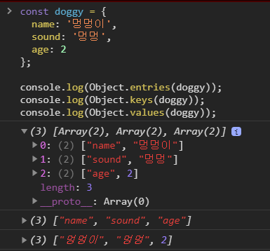 Object.values: [값, 값, 값] 형태의 배열로 변환
