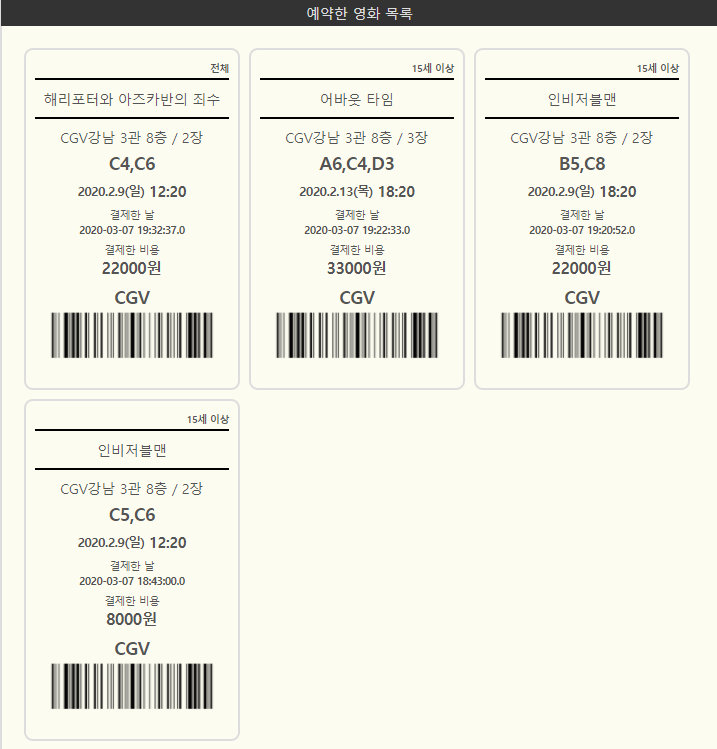 주요 목적: 크롤링을 활용해 현재 상영중인 영화 정보가져오기, 예약기능및 카카오페이 모듈을 활용한 결제 시스템 구현하기(개발자용 테스트 모듈), 마이페이지에서 예약한 정보 가져오기