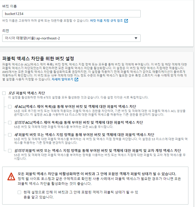 https://loy124.tistory.com/204 AWS S3 서버 구축 및 access key 발급받기 액세스 차단을 비활성화 한후 생성해준다. 버킷 정책을 수정해준다. { "Version": "2012-10-17", "Id": "Policy1577077078140", "Statem..