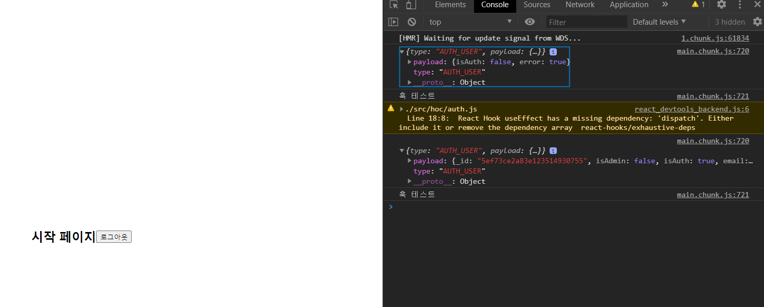 로그인및 로그아웃시 각각 훅 테스트가 잘 실행되는것을 확인할 수 있다.
