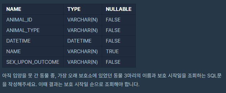 차집합이기때문에 서브 쿼리를 사용해서 문제를 해결하였으며 3마리를 가져오는거기때문에 LIMIT를 활용했다