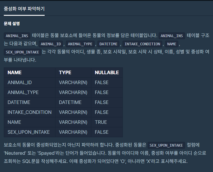 IF (SEX_UPON_INTAKE LIKE "Intact %", "X", "O") 중성화