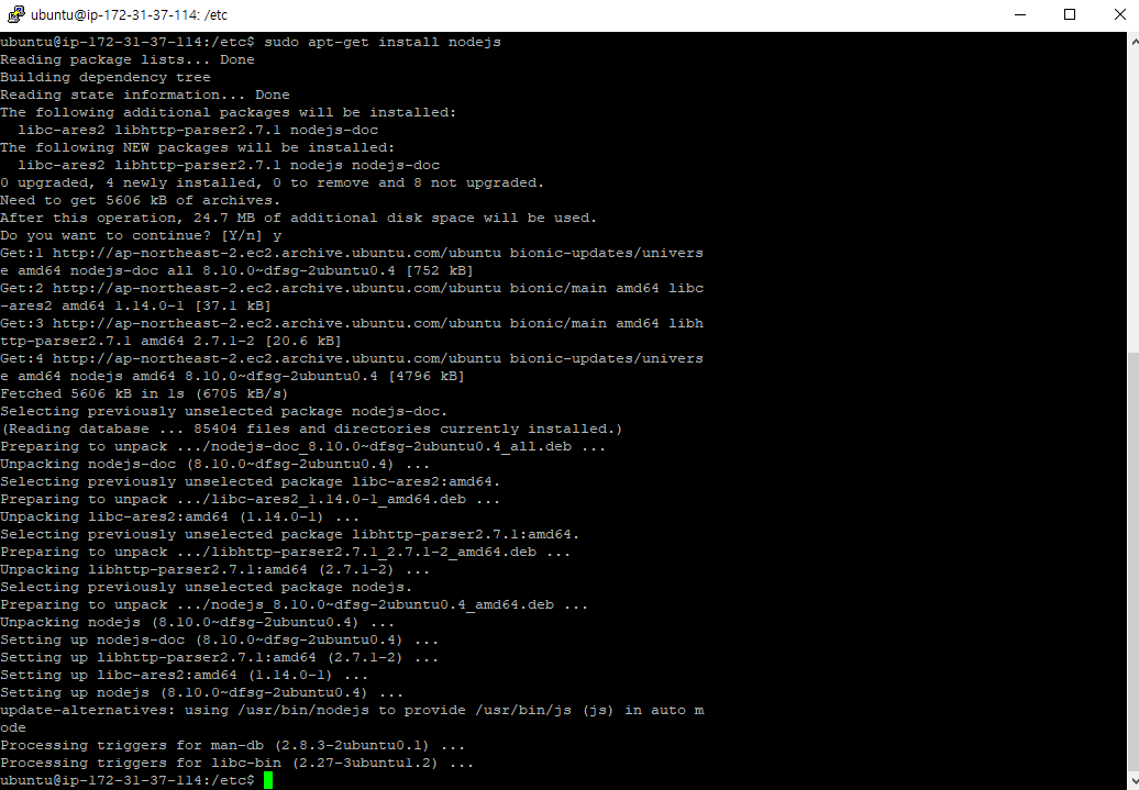 해당 명령어 를 통해 nodejs를 설치해준다.