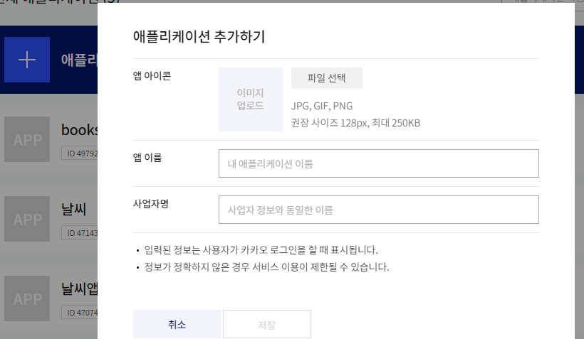 kakao developers에 접속해서 해당 애플리케이션을 추가해준다.
