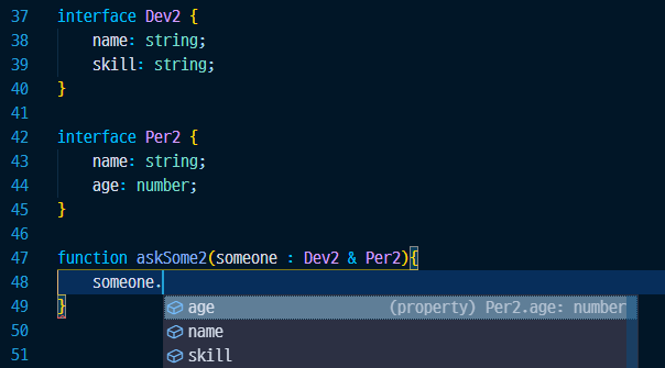 일반적인 생각으로는 Dev | Per 을하면 두 타입 모드 상속되서 합쳐져야 할것 같지만 typescript의 관점에서는