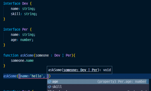 function askSome(someone : Dev | Per){