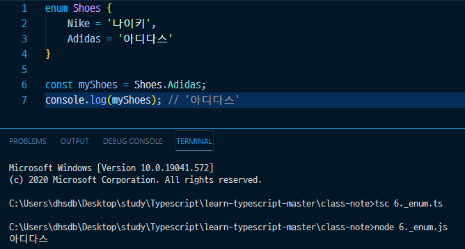 enum 타입에 문자형으로 값을 대입하게 되면 해당 값으로 출력이 된다.