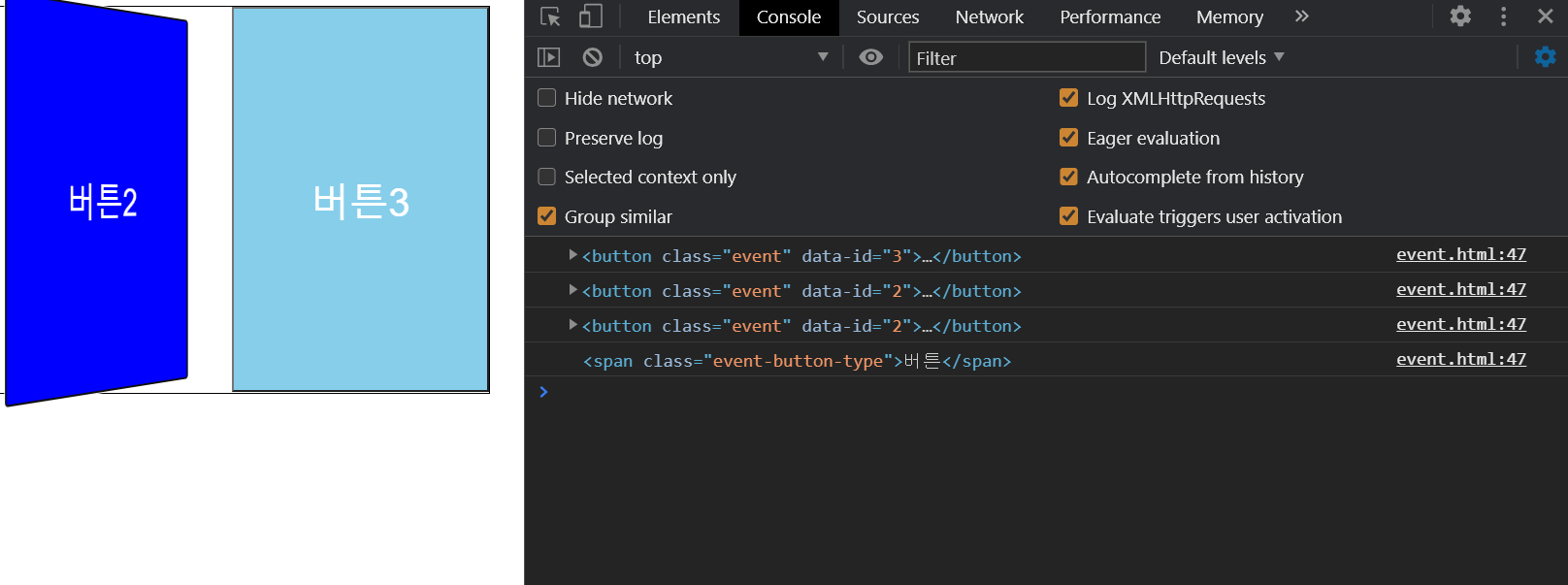 위와같이 버튼 전체를 클릭하는 경우에는 dataset이 나타나게 되어있지만 버튼이나 1, 2, 3 등의 span태그 내부를 누르는경우 정상적으로 dataset 을 가져올 수 없게된다.