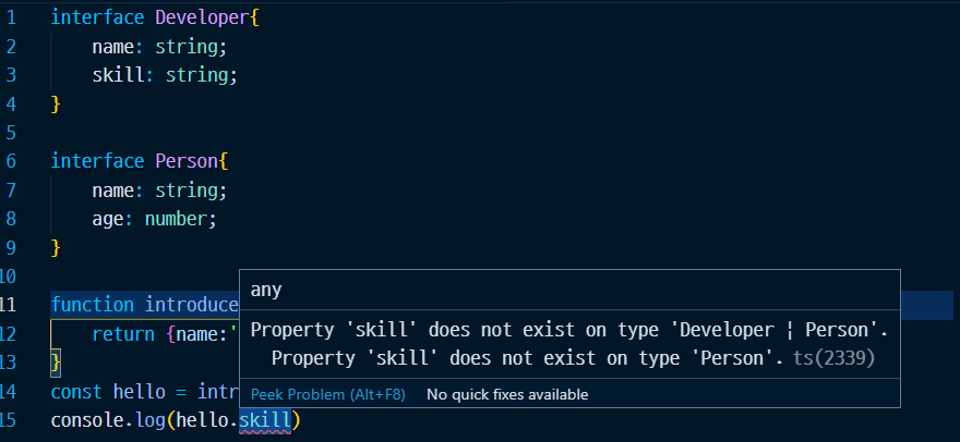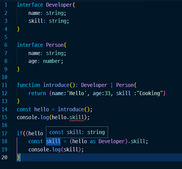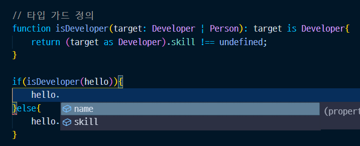 타입을 구분하는 isDeveloper 함수를 정의해서 target의 skill이 있을경우 isDeveloper true를 return해서 타입을 지정해준다.