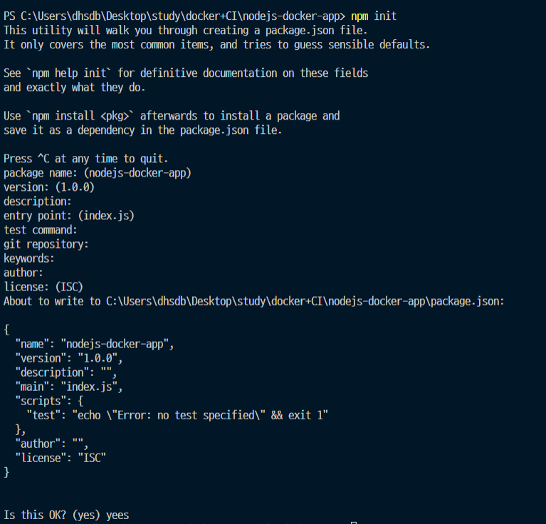 ls를 통해 내부 파일을 보면 package.json이 생성이 되지 않은 모습을 볼 수 있다.