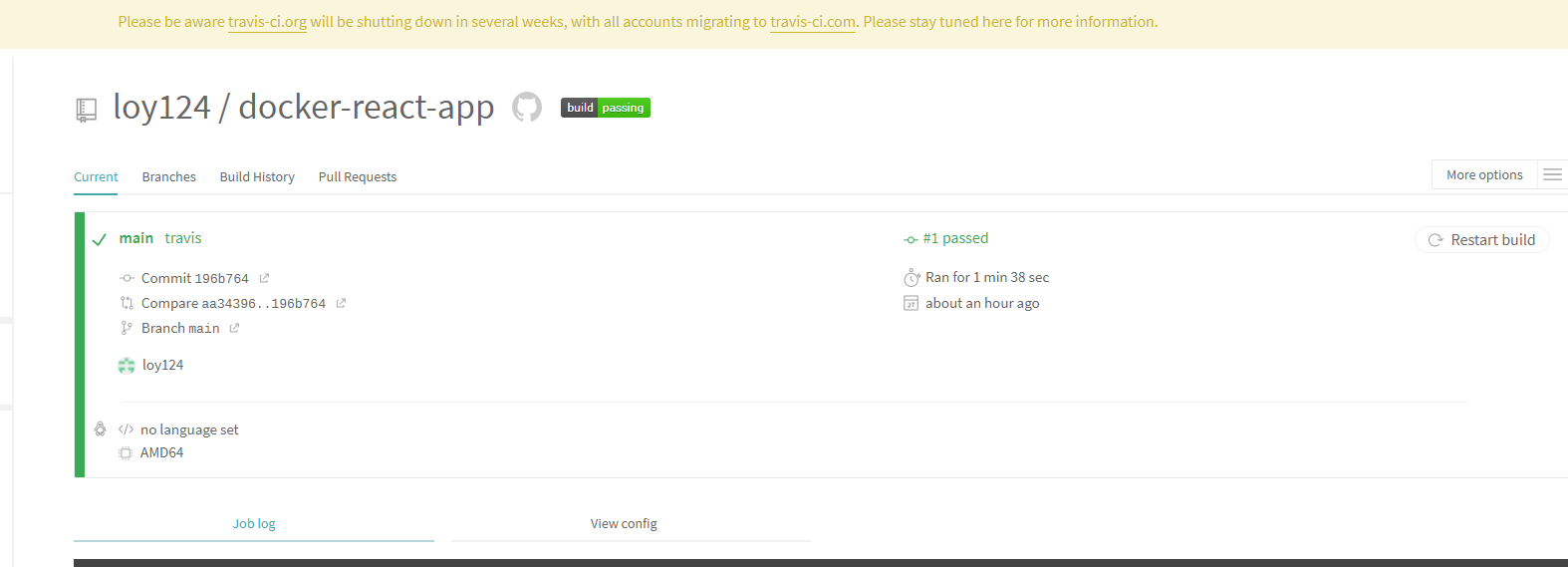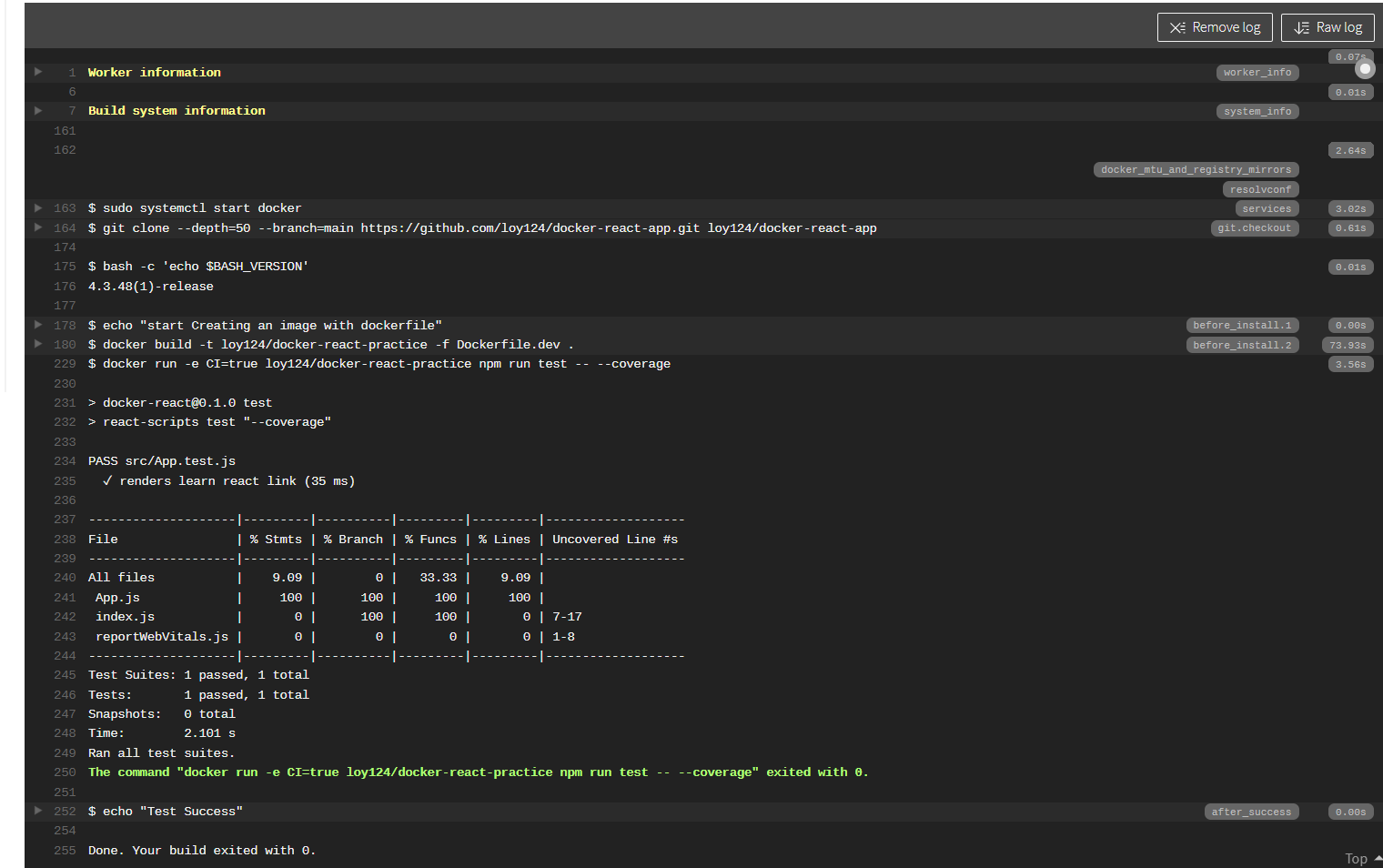 travis 사이트에 확인해보면 테스트 및 배포가 완료된 것을 확인 할 수 있다.