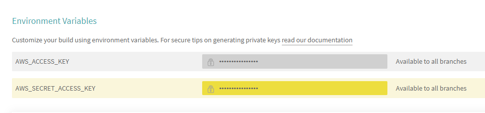 화면과 같이 ACCESS KEY와 SECRET KEY를 Environment Variables에 추가해준다.