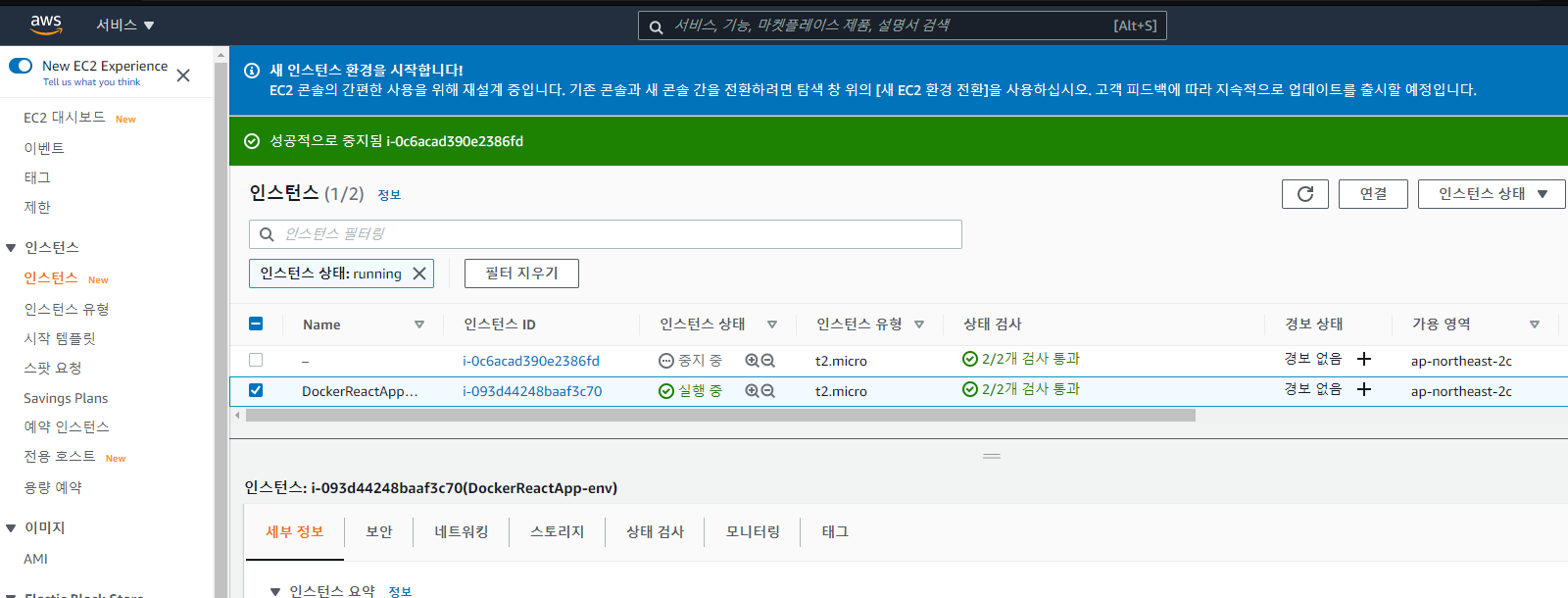 AWS EC2에 와보면 방금 생성한 대로 EC2가 생성되어 있다.