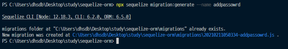 npx sequelize model:generate --name 테이블 이름 --attributes 컬럼이름