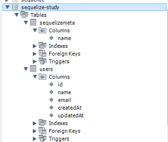 이제 DB를 확인해 보면 table은 생성이 되었는데 만들지 않은 sequelizemeta 테이블과 users 테이블이 정의 된것을 확인할 수 있다.