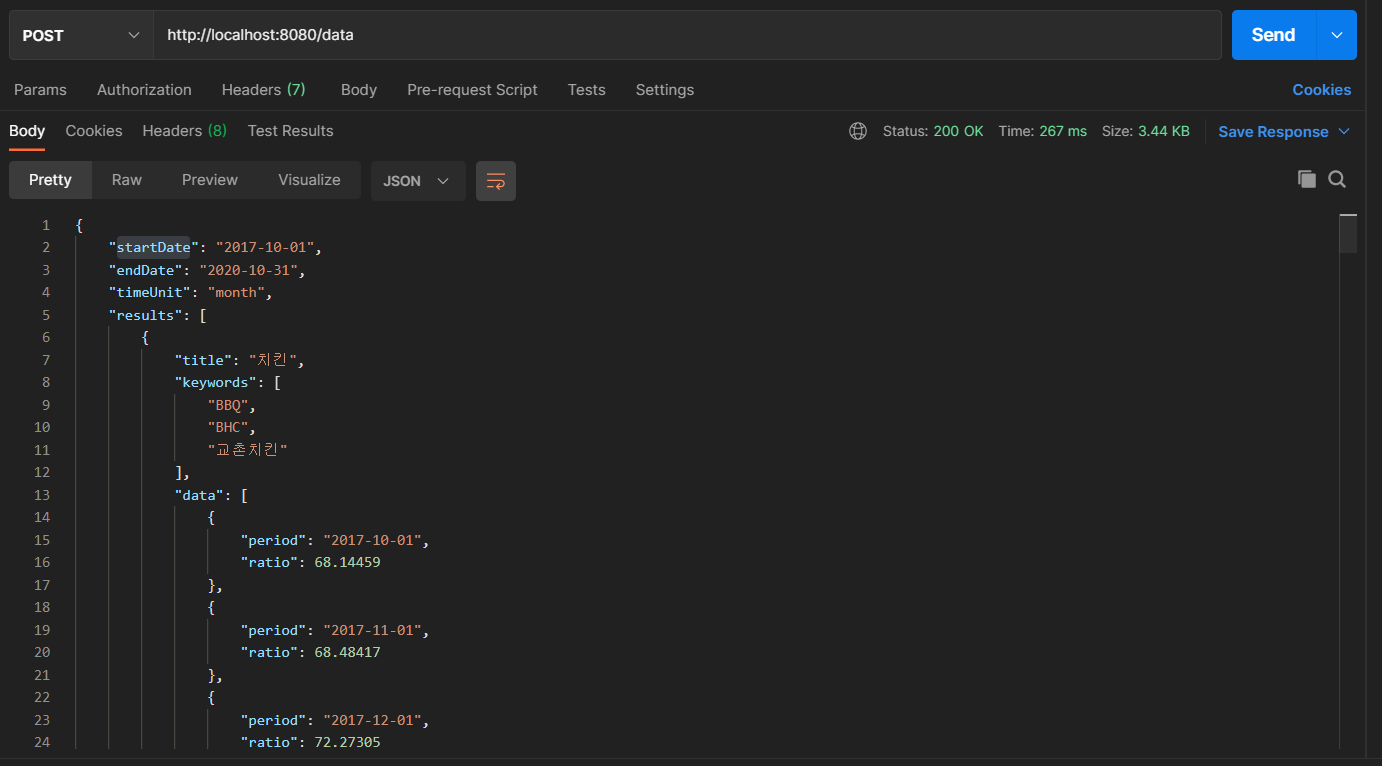 해당까지 진행하였으면 서버를 켠 뒤 POSTMAN을 활용해서 데이터 요청을 보낸다.
