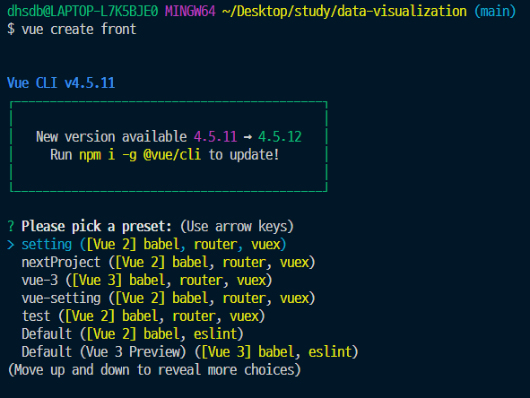 먼저 2버전의 Vue-CLI를 통해 프로젝트를 생성해준다.