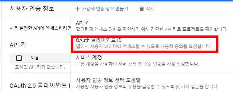 API 및 서비스 -> 사용자 인증 정보로 이동한다.