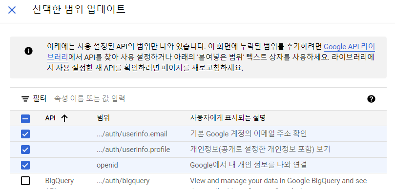 범위 추가 또는 삭제를 누를 경우 가능한 권한을 보여주게 되는데 기본으로 되어있는 3가지를 설정해주겠다.