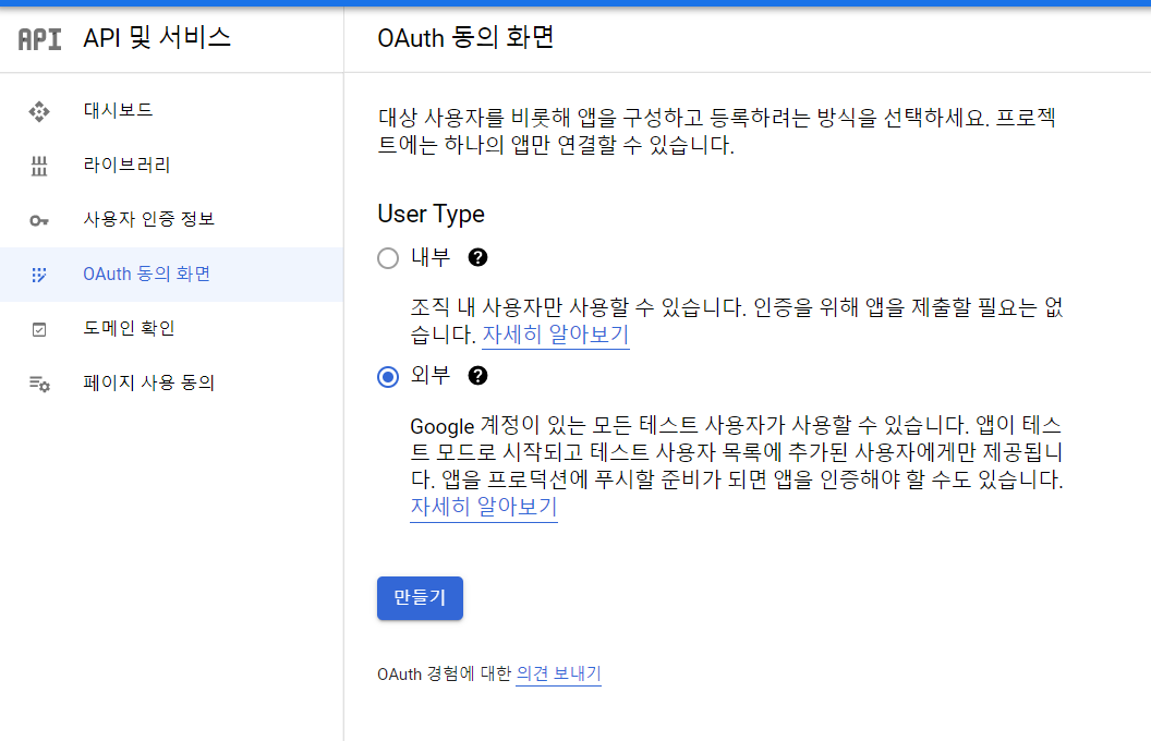 Google 계정이 있는 모든이가 접속 할 수 있도록 외부로 설정하고 만들기를 눌러준다.