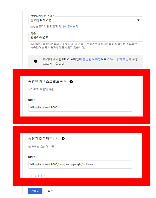 위의 구글과 마찬가지로 localhost:8000번대를 등록해주었다.