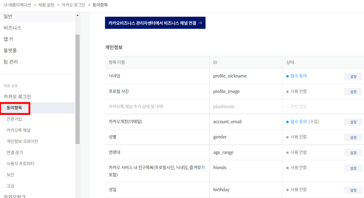 이제 카카오 로그인 -> 동의항목으로 이동해서