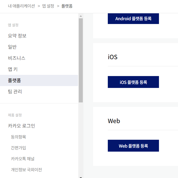 이제 플랫폼 -> WEB 플랫폼 등록을 해준다.