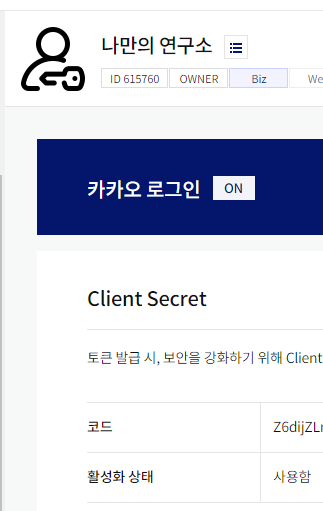 카카오 로그인 -> 보안으로 이동해서 Client Secret을 활성화 하고 발급해준다.