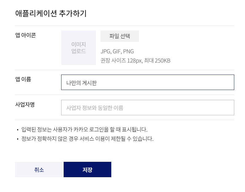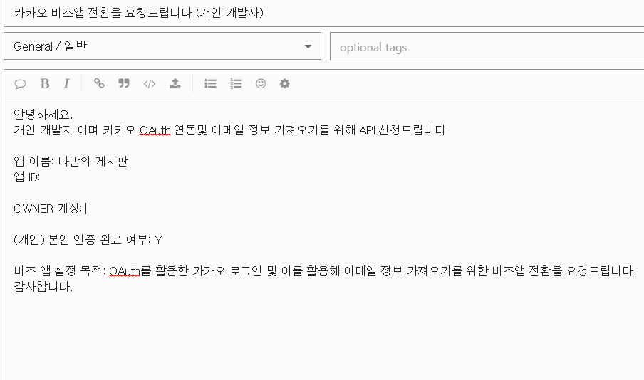 2. 카카오 게시판에 해당 애플리케이션을 비즈앱으로 전환 요청하기