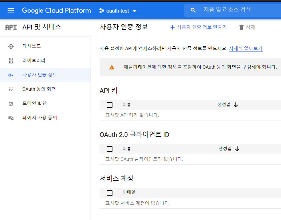 프로젝트를 생성하면 이제 Oauth 동의화면을 구성하라는 메세지가 나온다.