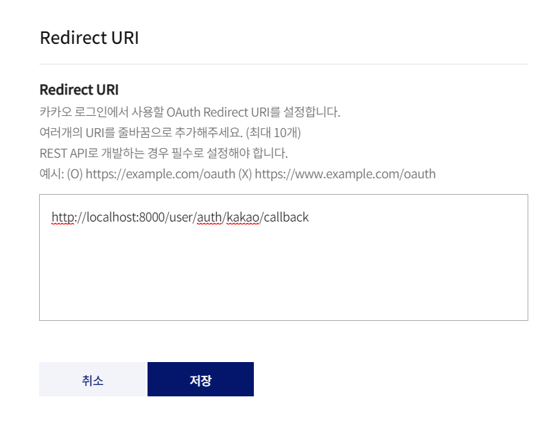 http://localhost:8000/user/auth/kakao/callback 로 등록해 주었다.