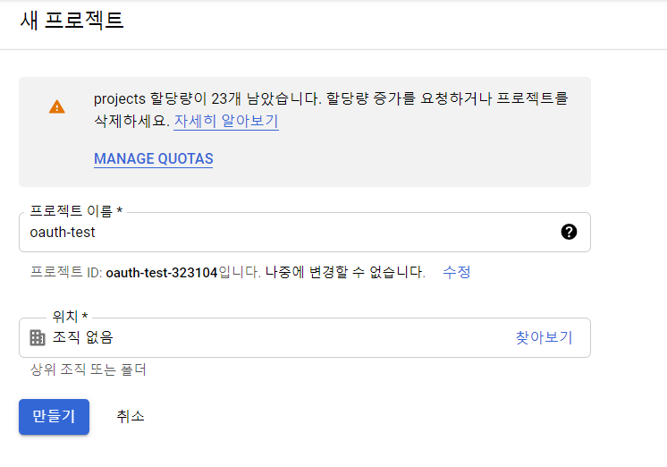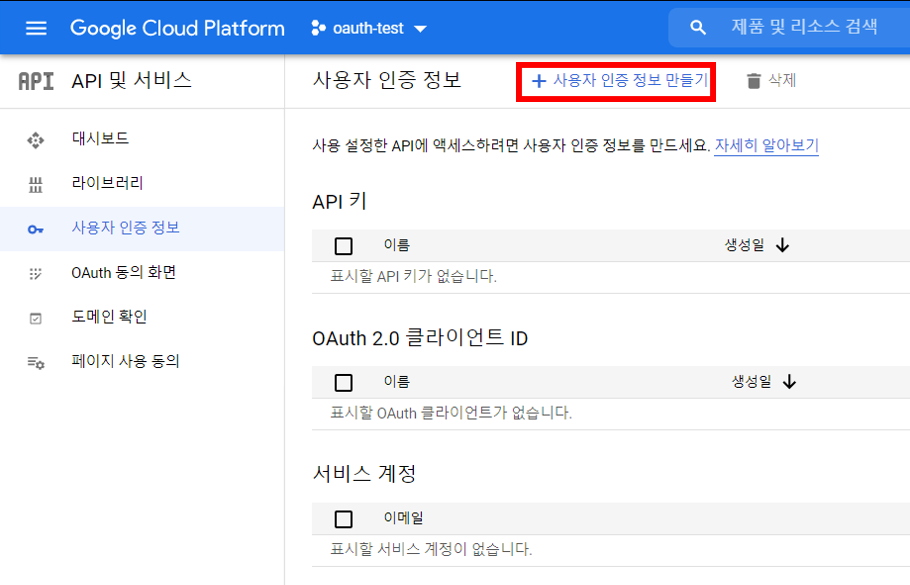 oauth-test라는 이름으로 새 프로젝트를 만들었다.