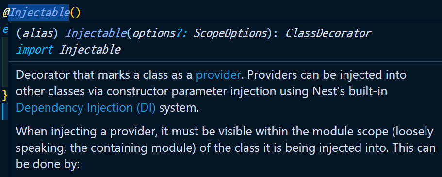 해당 Injectable 데코레이터는 해당 class가 의존성으로 주입(DI)될 수 있다고 정의해준다.